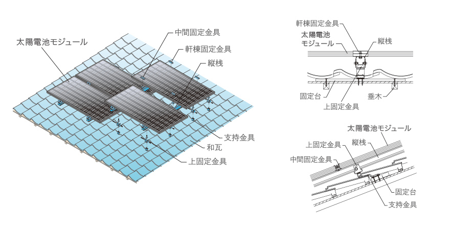 屋根材本来の固定方法に沿った取り付け方法を採用し、屋根材を加工せずに設置が可能。